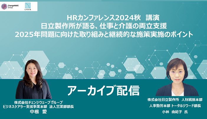 2024年11月HRカンファレンスでの講演のアーカイブ配信となります。 両立支援と言っても、どのように施策を優先するのか悩むご担当者の方も多いです。 本講演では、早くから仕事と介護の両立支援をされていた 日立製作所様の風土醸成・意識改革につながる継続的な取り組みを 本講演でご紹介します。