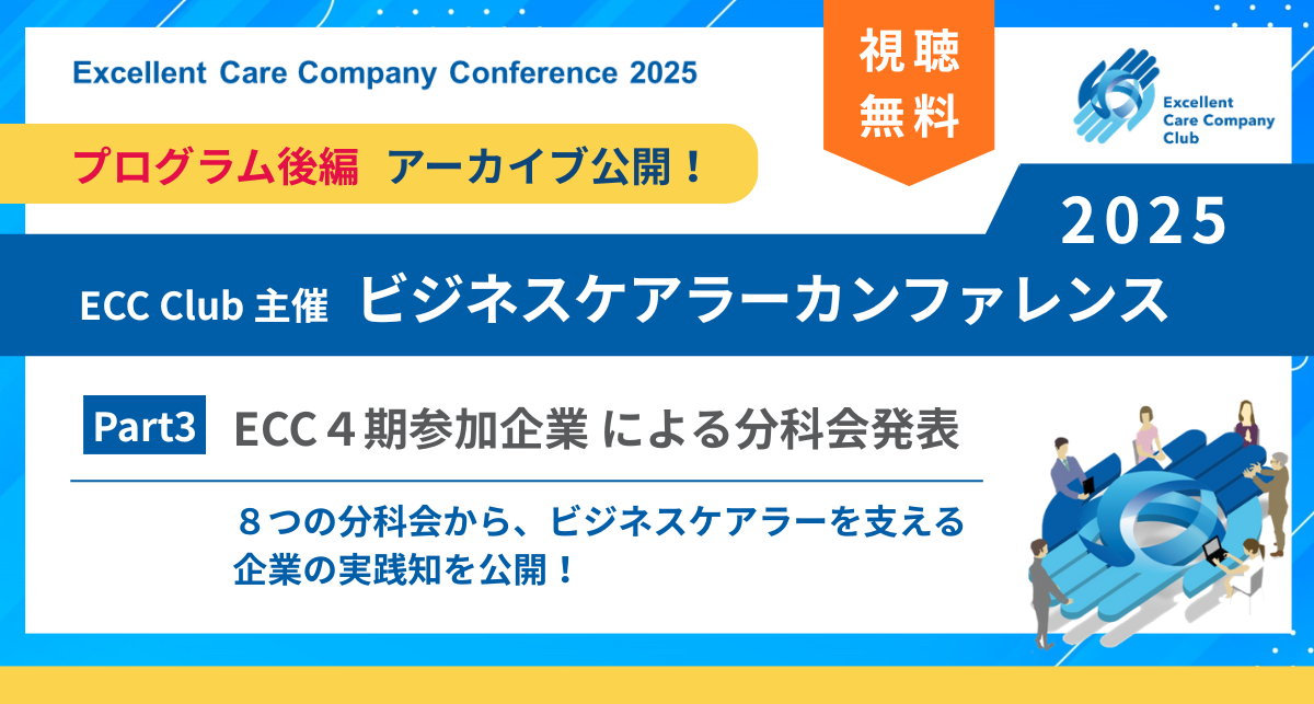 ”様々な企業の担当者が介護に対して検討し、打ち手や意気込みなど発表する機会はめったになく、 今回のイベントで一体感を感じることができ、また他社様の施策や参考になる部分も多くありました” チェンジウェーブグループが運営する、大手企業22社参加のECC Club主催ビジネスケアラーカンファレンス2025が 11月7日に開催されました。 カンファレンス前半では、 東京大学名誉教授の佐藤博樹先生をお招きし、「リスク・マネジメントとしての仕事と介護の両立支援」として基調講演をいただきました。 また、今期参加の22社のメンバー企業がECC Clubの活動として収集した仕事と介護の両立の当事者体験談(ロールストーリー)について、 職務領域での支援視点での分析などをご紹介しました。 ぜひ、この機会にご視聴ください。